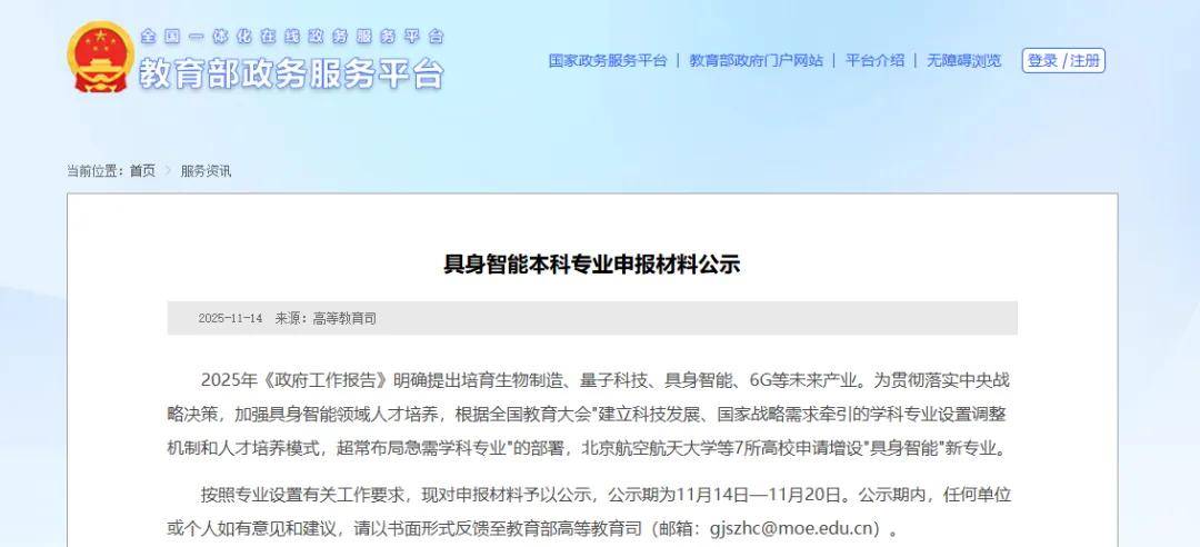 本科专业申报材料公示,航空航天大学、理工大学、上海交通大学等7所“双一流”高校集体申请增设这一全新专业。这一行动间接响应了2025年《工做演讲》中明白提出培育“具身智能”等将来财产的地方计谋决策。