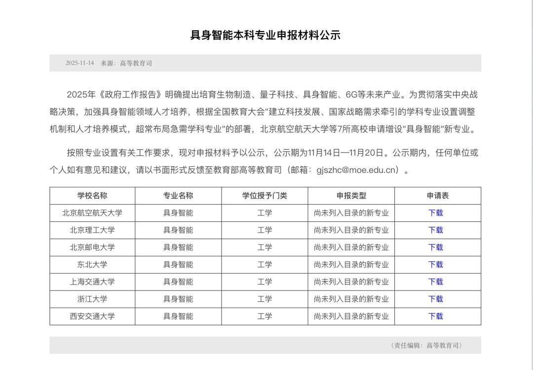 不外,相较于研究院的“集团军做和”,高校、企业及科研机构更遍及的结构形式是各类特色尝试室 —— 例如大学的 MARS Lab、ISR Lab、TEA Lab 等。这类尝试室规模凡是小于研究院,多由高校焦点教师或企业研发团队牵头,聚焦细分手艺标的目的,同步承担学术培育、科研产出取财产项目合做三大本能机能,成为具身智能研究的“毛细血管”。从过去以尝试室为单元、“一位导师率领几名博士生、研究帮理”的分离式摸索,升级为现在研究院牵头、跨学科协同、产学研联动的规模化攻坚。这种从“单兵突围”到“集团做和”的进化,背后恰是行业对具身智能手艺落地的火急需求,以及其做为下一代 AI 焦点赛道的计谋共识。上海交通大学已率先开设全球首个具身智能四年制工学本科专业,依托人工智能学院授予工学学位,首年招生 30 人。除了,正在教育部高档教育司比来发布的通知布告中,我们也能够发觉,包含正在内的,北航、北理、北邮、、浙大、西交、哈工大、南航等 9 所高校都正在连续申报具身智能本科专业。